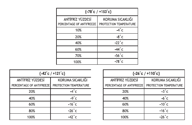 ZEYCHEM -ANTIFREEZE kullanim şekli ve dozajlama miktari aşağıdaki tabloda belirtilmiştir.